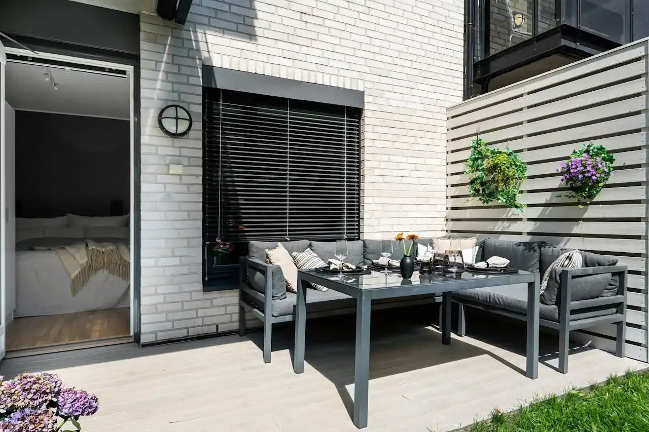 The deck features stylish patio furniture, a small built-in planter with flowers